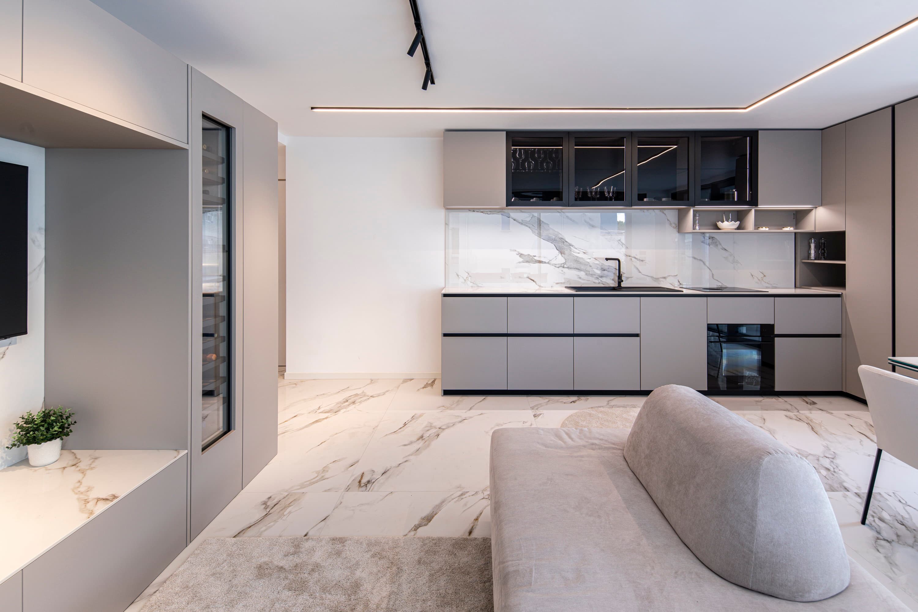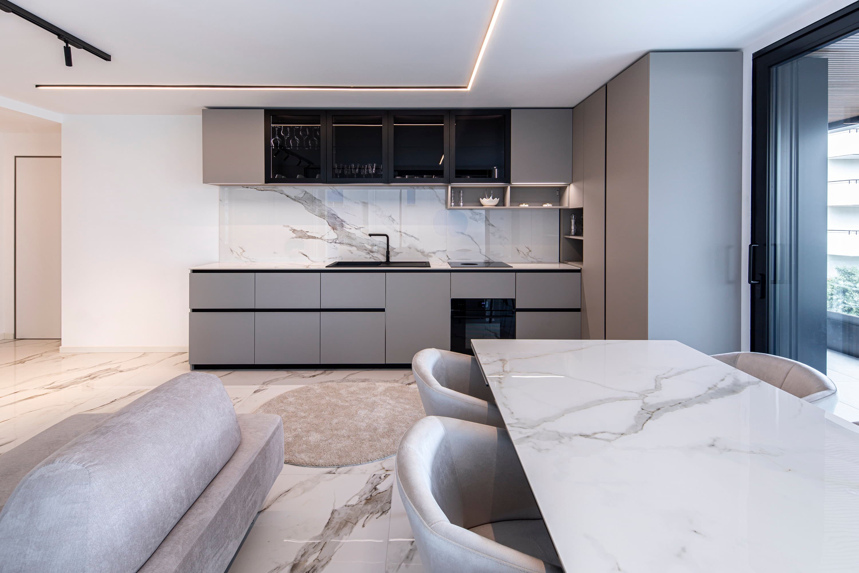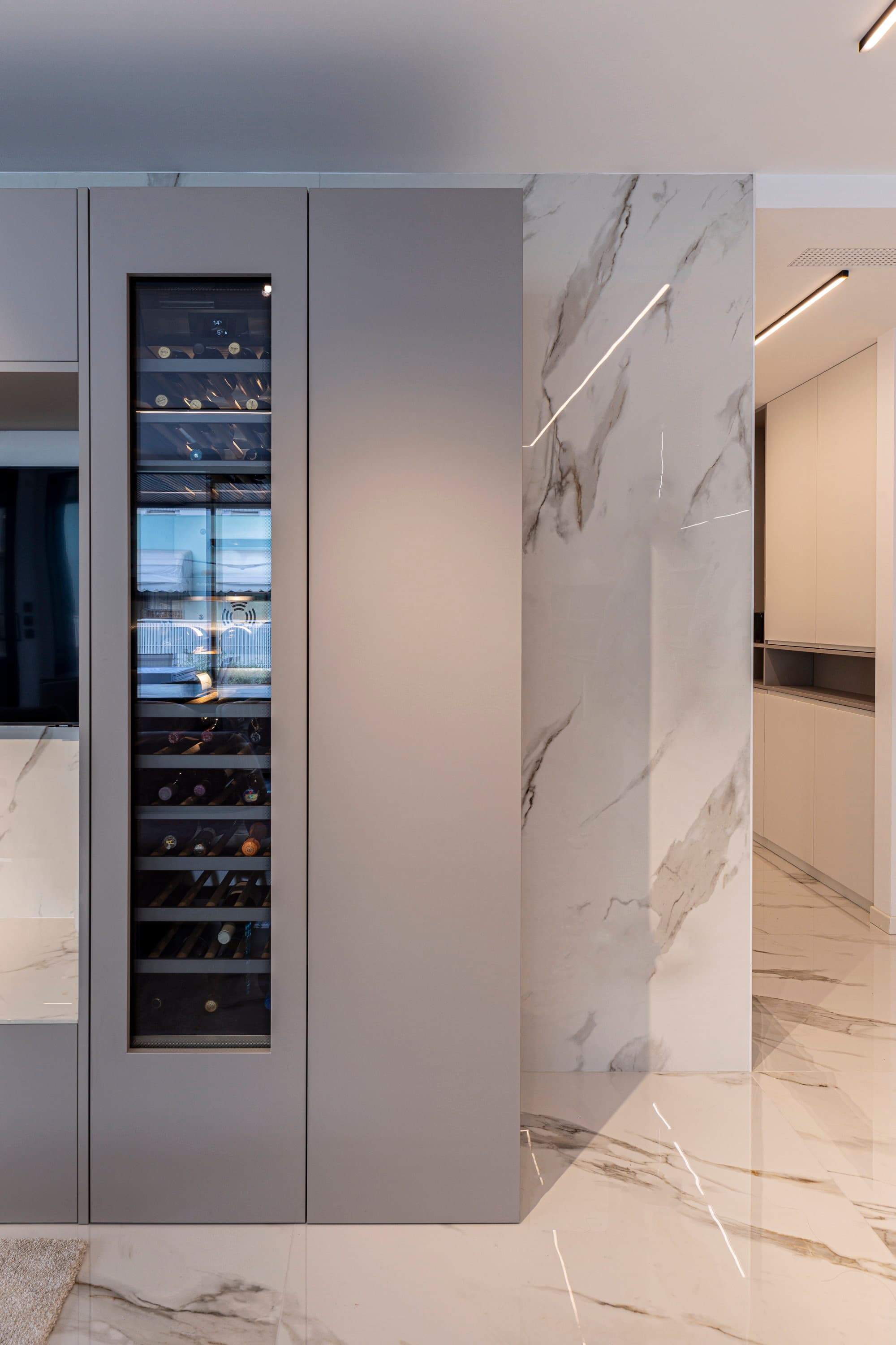The furnishings, made of Fenix or matte lacquer, precisely echo the warm and refined tones of the marble's veins, contributing to a coherent and harmonious atmosphere. The silky surfaces of the furniture gently contrast with the shine of the marble, adding depth and visual softness.