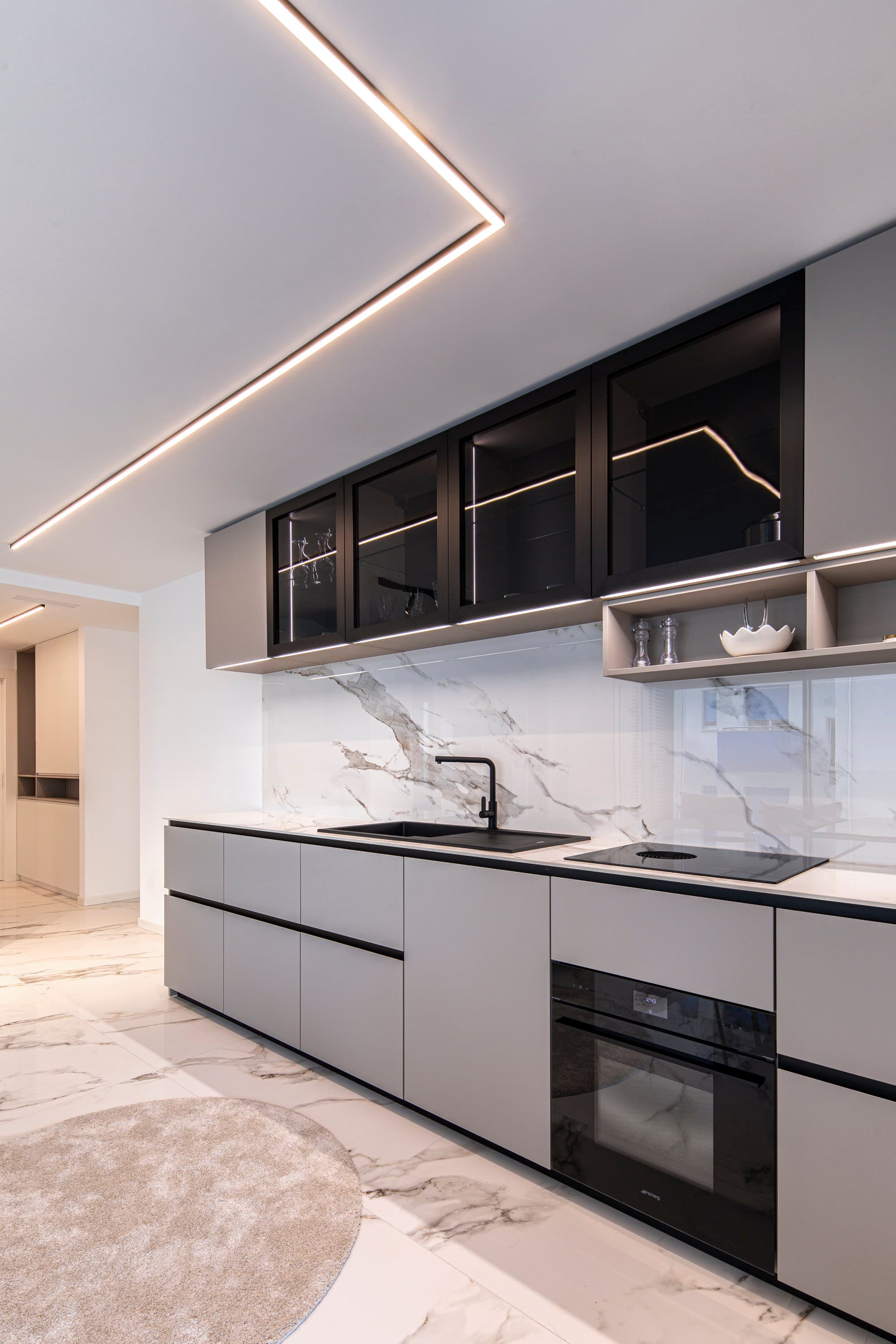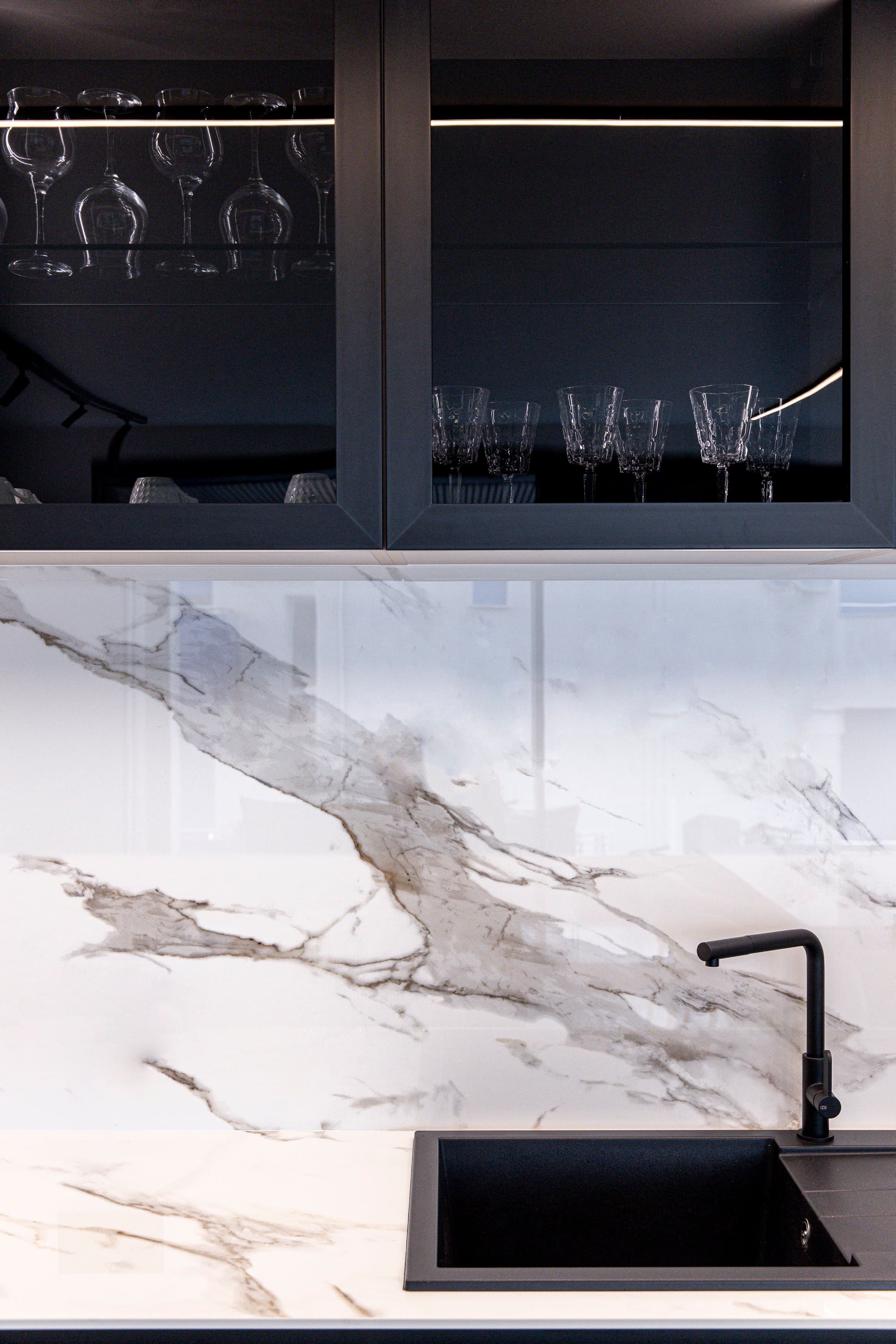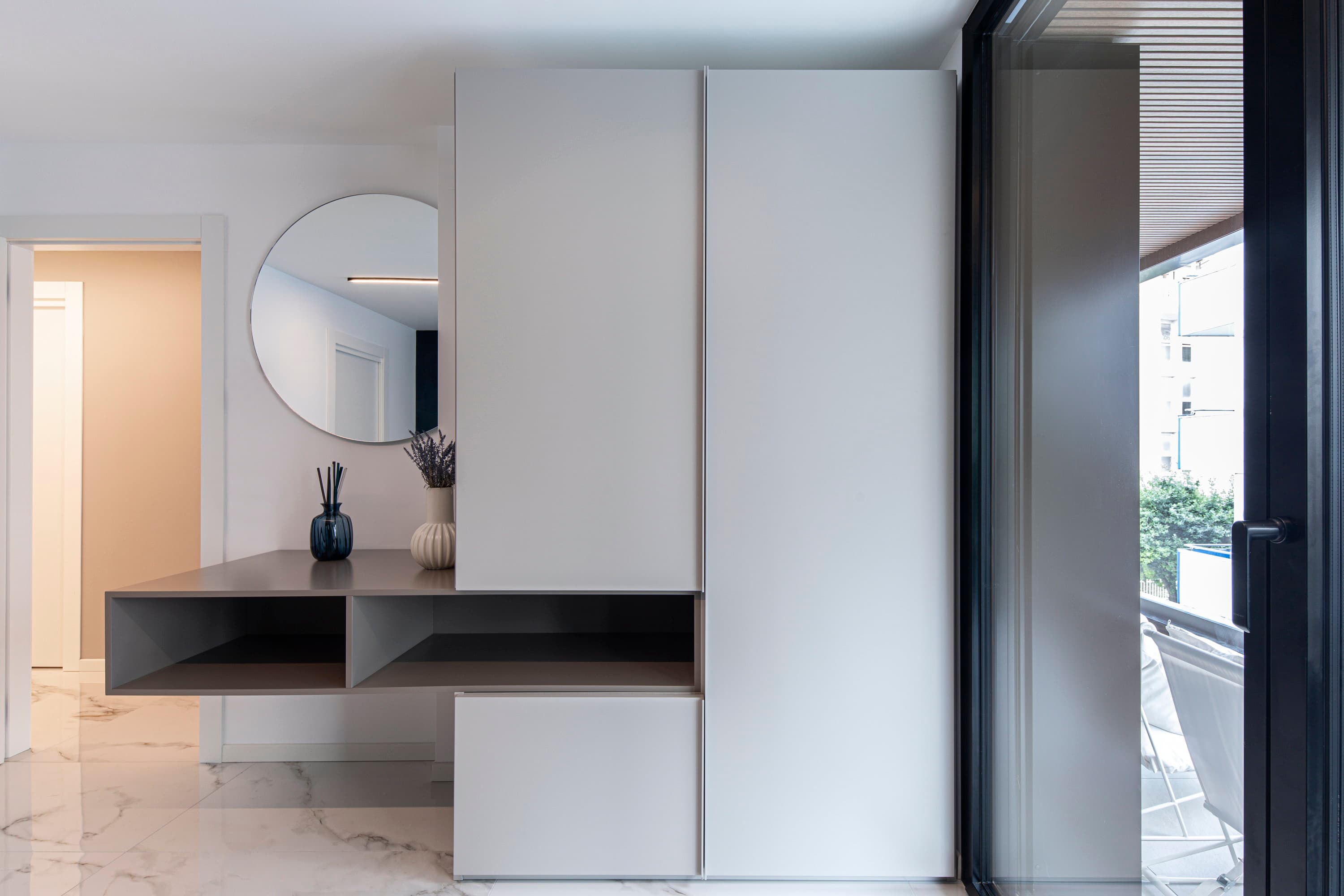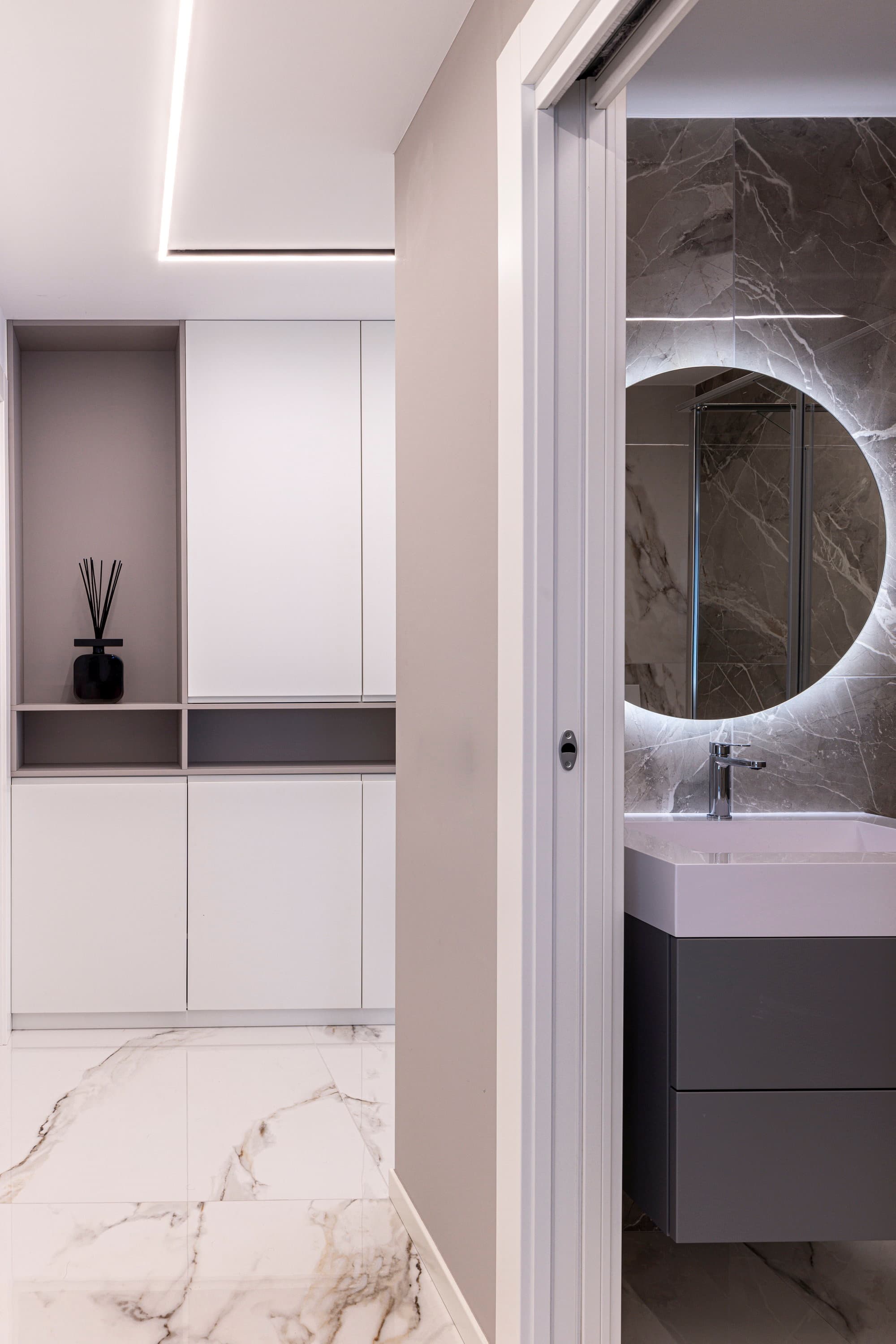 The furnishings, made of Fenix or matte lacquer, precisely echo the warm and refined tones of the marble's veins, contributing to a coherent and harmonious atmosphere. The silky surfaces of the furniture gently contrast with the shine of the marble, adding depth and visual softness.