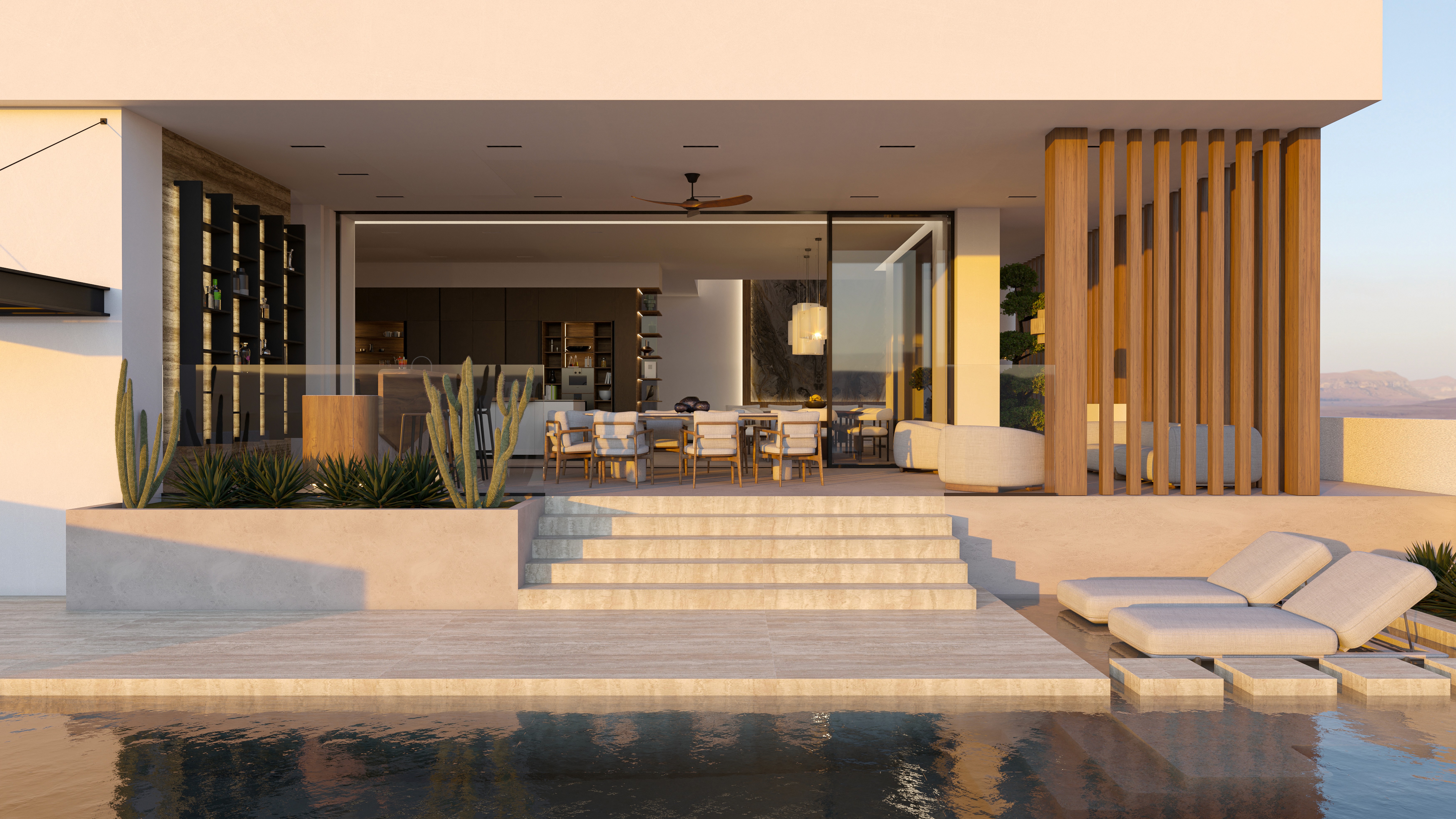 Every detail has been carefully studied: from the authentic marble floors to the travertine cladding extracted from Mexican quarries, to the most sophisticated finishes, such as the golden faucet that adorns the master bathroom. The large sliding glass doors dissolve the boundaries between inside and outside, providing a seamless living experience where the seascape becomes an integral part of the domestic space.