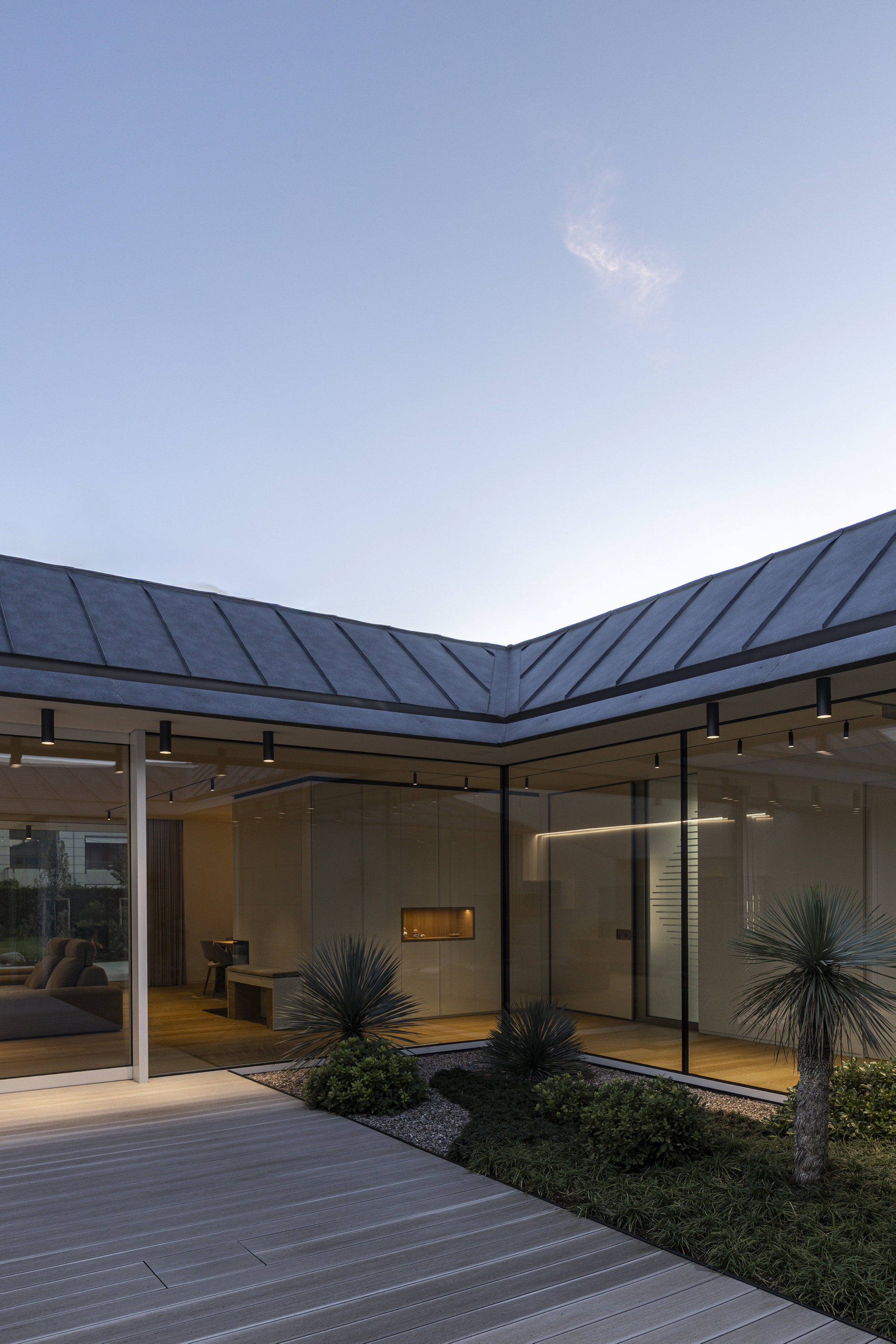 Superata la soglia, lo spazio interno si apre in un ambiente fluido e articolato, in cui living e cucina convivono in un unico sistema spaziale continuo. Il patio centrale, attorno al quale si affacciano gli ambienti principali, diventa il fulcro spaziale della casa. Qui l’architettura si apre, lasciando che luce naturale e verde filtrino negli interni, amplificando la percezione dello spazio e dilatando i confini dell’abitare. Le grandi superfici vetrate dissolvono il limite tra dentro e fuori, trasformando il patio in una vera e propria stanza all’aperto, utilizzabile durante tutto l’arco della giornata e delle stagioni.