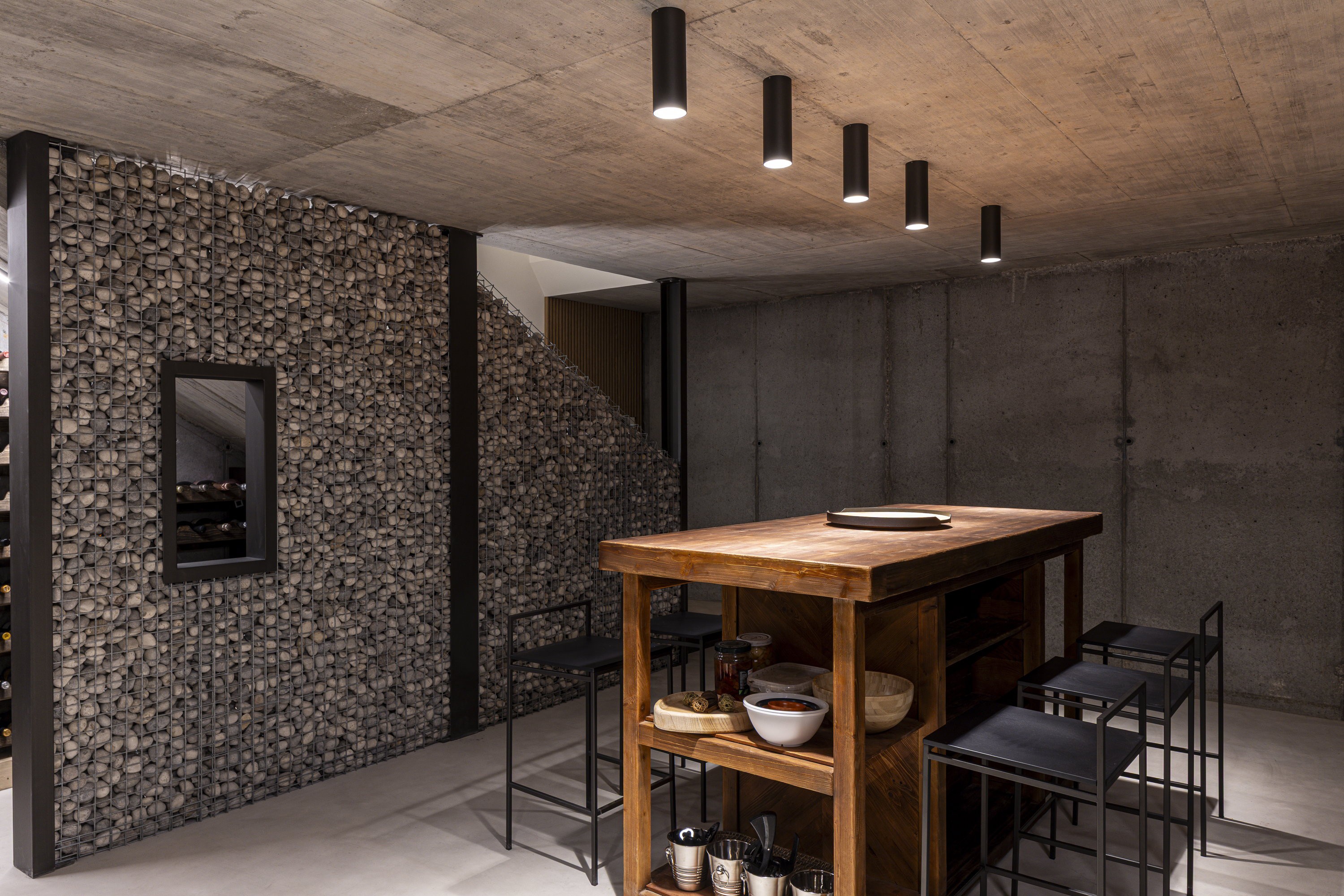 All’interno, la sauna rappresenta un ulteriore momento di raccoglimento: uno spazio essenziale, interamente rivestito in legno, in cui l’architettura si riduce all’essenziale per lasciare spazio all’esperienza sensoriale. La taverna interrata, infine, introduce una dimensione più informale e raccolta dell’abitare. Collocata al di sotto del volume principale, si configura come uno spazio dedicato alla socialità e al tempo libero, caratterizzato da un’atmosfera più intima e da una materialità coerente con il resto della casa, ma declinata in chiave più materica e avvolgente.
