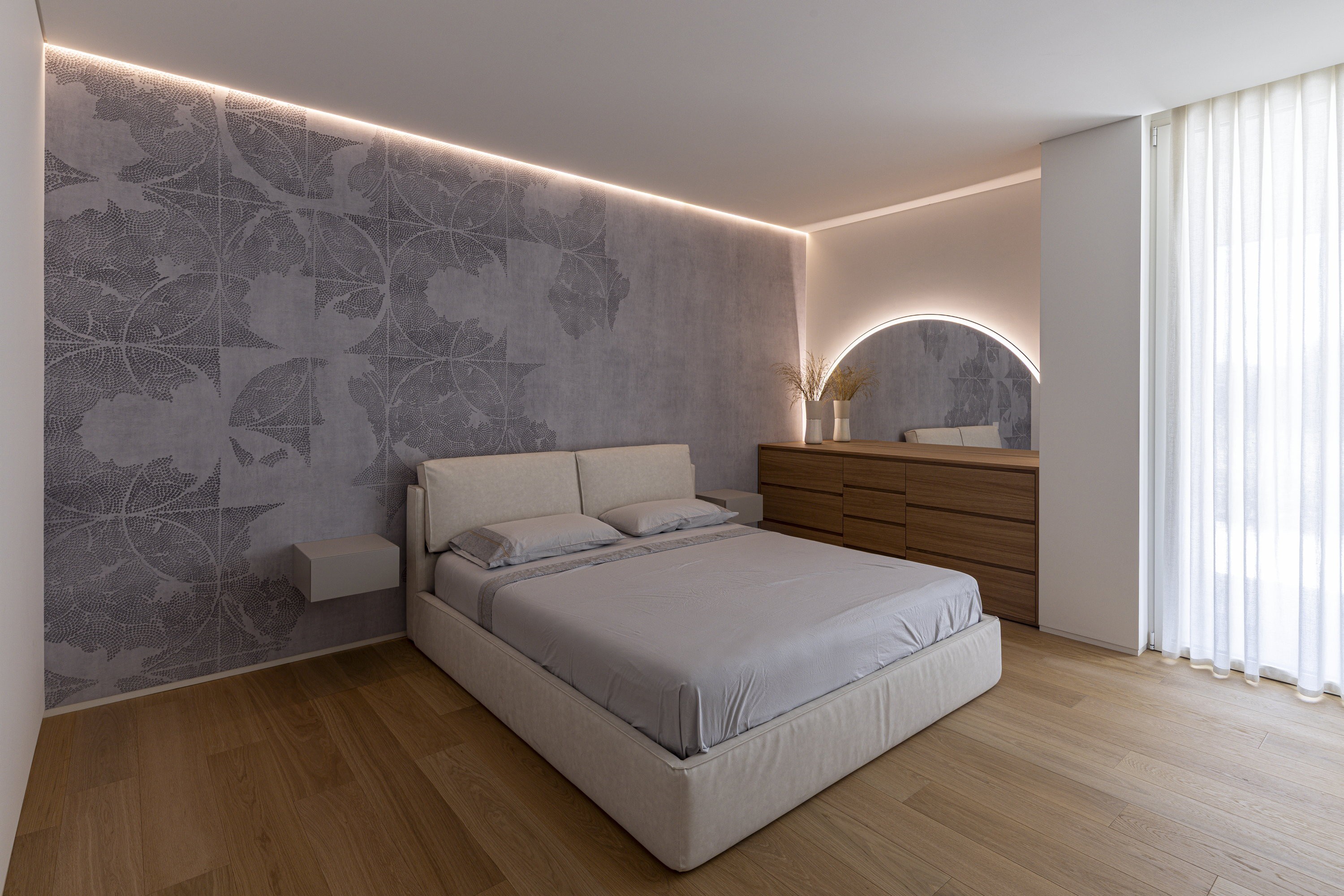 La zona giorno si configura come un ambiente misurato ma accogliente, in cui ogni elemento è pensato per favorire una percezione di ordine e continuità. Gli arredi, scelti con attenzione per forme e proporzioni, non interrompono il flusso spaziale, ma lo assecondano, lasciando che siano luce e materiali a definire le diverse funzioni. L’illuminazione gioca un ruolo centrale: tagli luminosi incassati, binari minimali e corpi sospesi disegnano lo spazio con segni discreti, modulando l’atmosfera e valorizzando le superfici. Il legno, utilizzato per pavimenti, soffitti e arredi su misura, dialoga con superfici minerali e cromie neutre, costruendo un linguaggio caldo ed essenziale, capace di attraversare l’intera abitazione con coerenza.