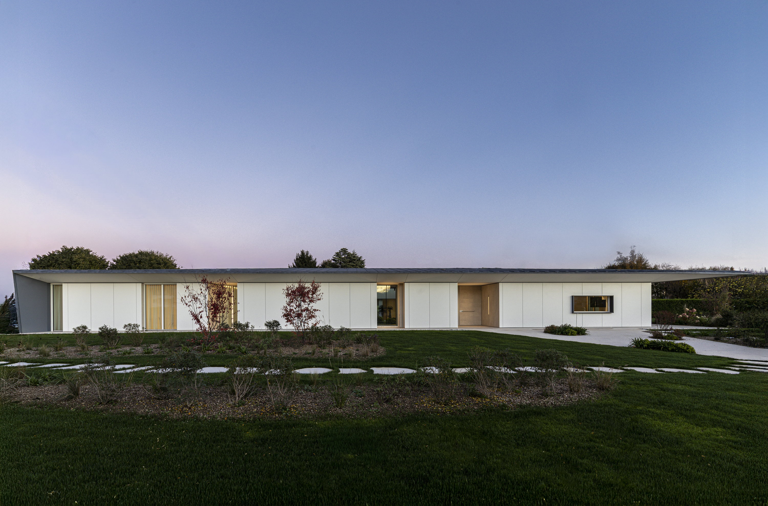 L’architettura rinuncia a qualsiasi enfasi formale per concentrarsi su equilibrio, proporzione e relazione con il suolo. La casa si posa sul terreno con naturalezza, seguendo una logica di continuità piuttosto che di contrasto: il giardino non è semplice cornice, ma parte integrante del progetto, disegnato attraverso percorsi sinuosi, superfici minerali e vegetazione controllata, che guidano lo sguardo e il movimento verso l’ingresso. I setti opachi e le superfici chiare, interrotte da tagli precisi e aperture calibrate, costruiscono una facciata discreta, introversa, che tutela la privacy senza rinunciare alla luce.